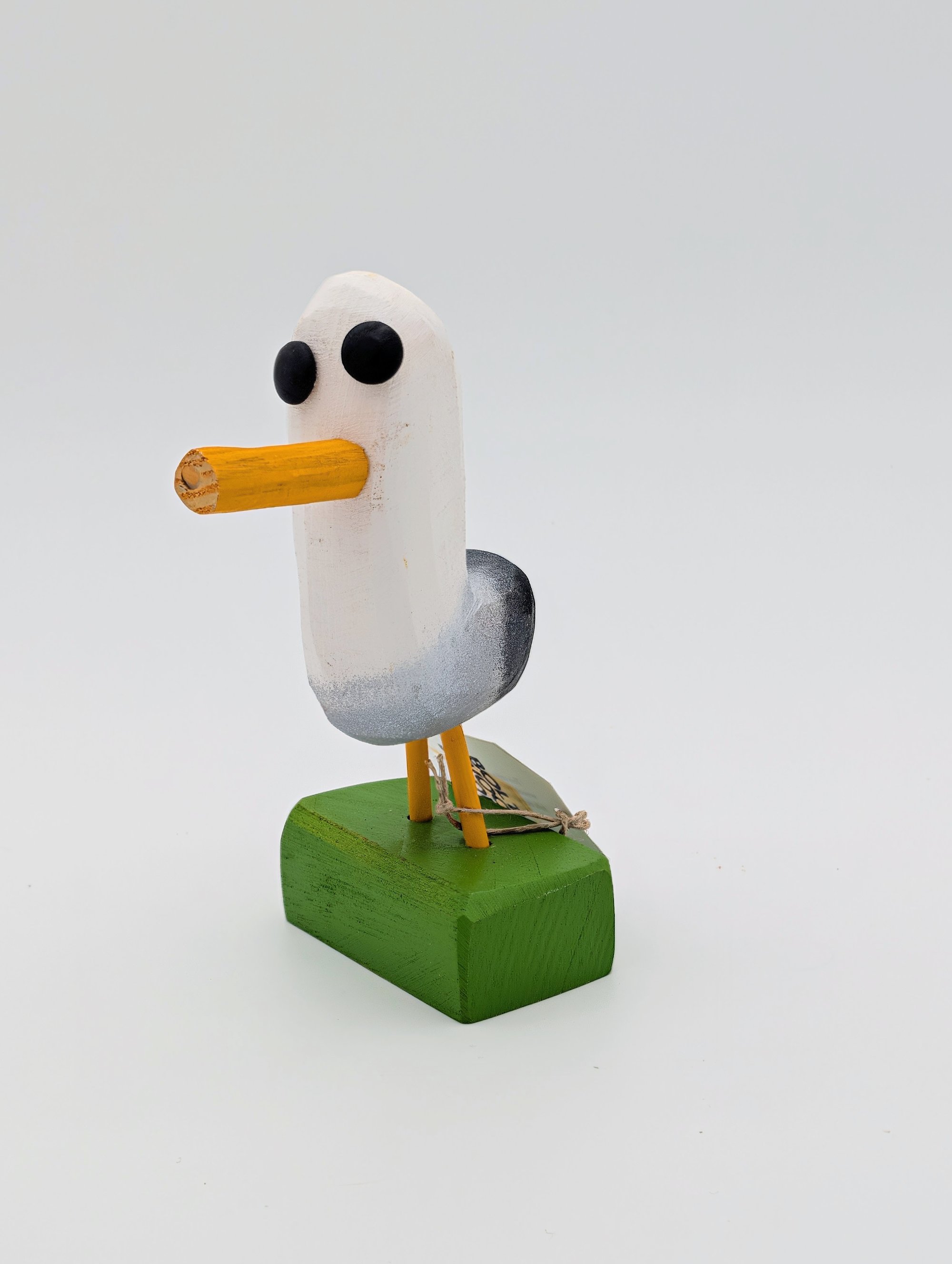 This unique, hand-carved and painted wooden seagull is a one-of-a-king piece of folk art, with its own distinct character and charm. Crafted with care and attention by local Halifax artist Jarrett Sampson.